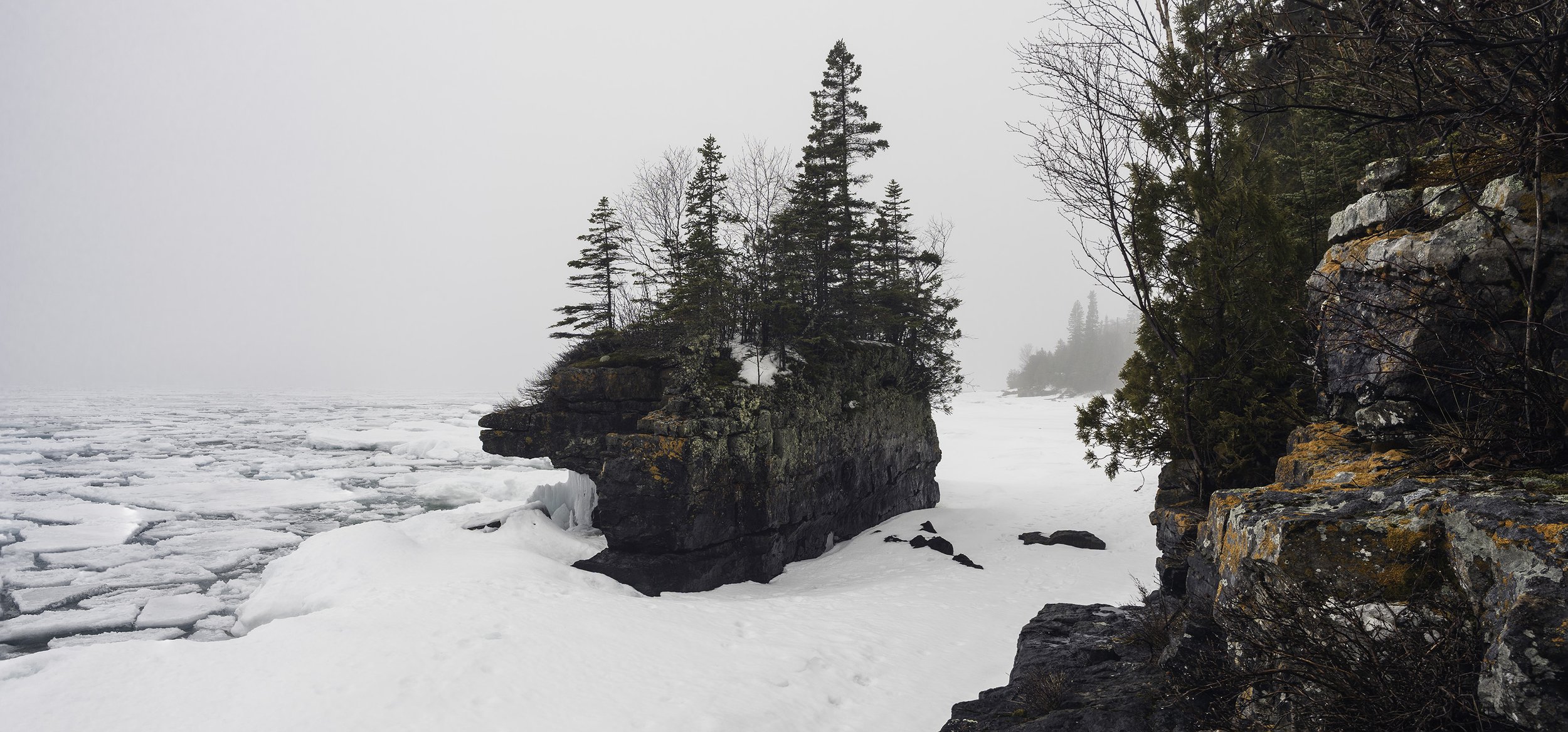 I spent a full day hiking on ice along the frozen lake shore of Lake Superior. The day was overcast with low clouds obscuring the top of the cliffs. I was mesmerized by the view, allowing myself to imagine the cliffs being much taller than I know them to be.