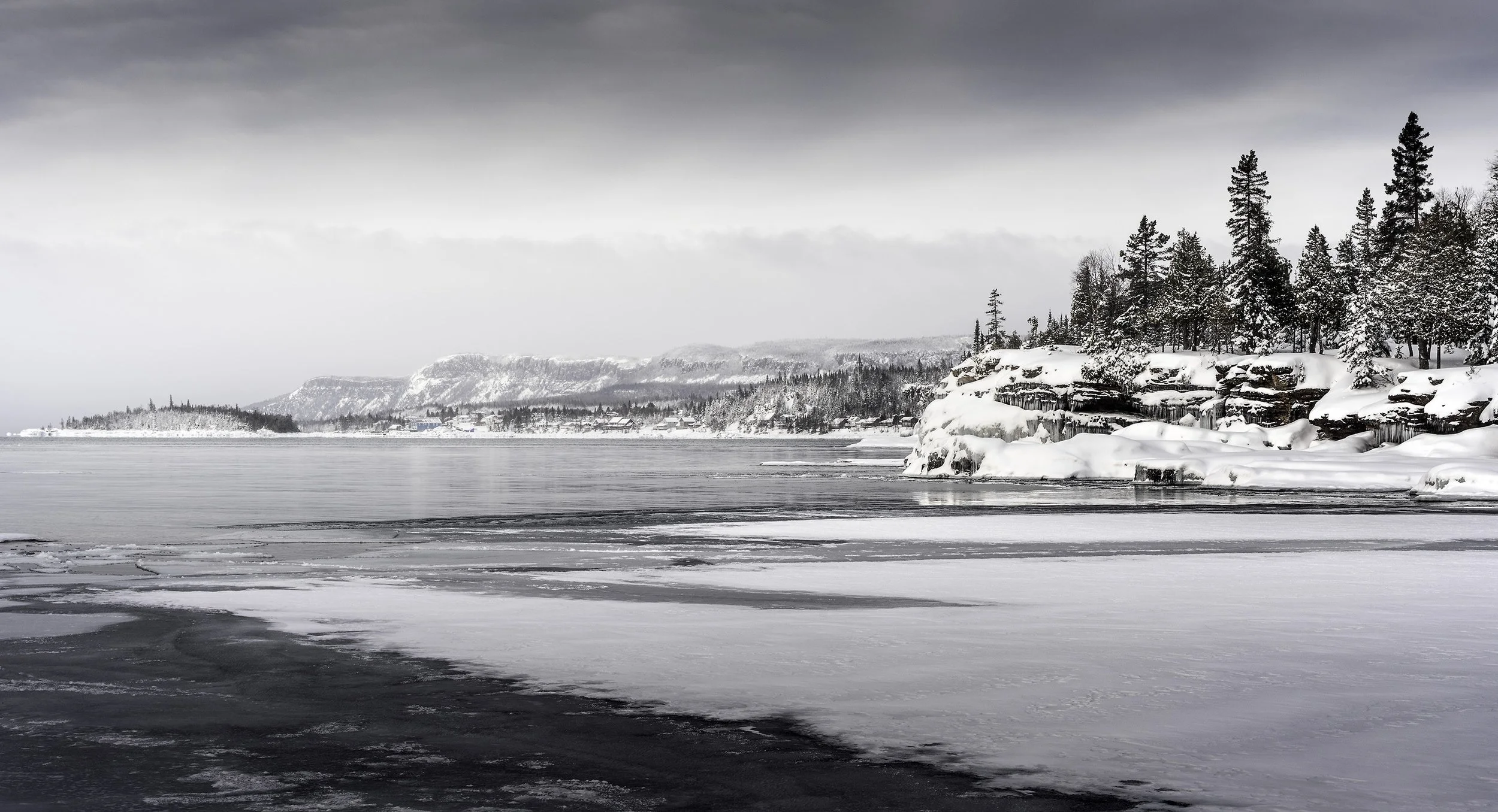 A cave I stumbled upon while hiking the frozen lake shore of Lake Superior off Fort William First Nations a few years ago. I had an opportunity to revisit that beautiful shoreline again recently, and of course I wanted to see what the cave looked like this winter. A beautiful thing about winter is that the same landscape might look very different season after season. Anyway, a feature of the cave I missed last time was this window which is blocked by icicles. This photograph presented several technical challenges from the standpoint of the extreme dynamic range and the need to do focus stacking. I had to take close to 20 photos at different exposures and focal points and then combine them all to get everything lit right and in focus.