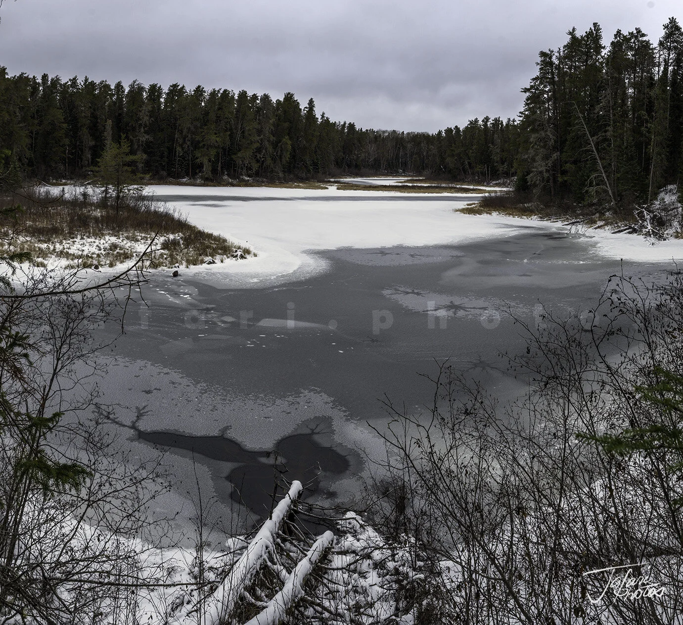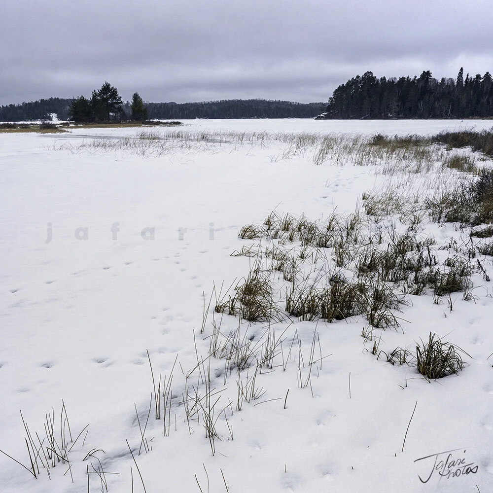 I was up at 5:30 and headed out of the door at 6:30. The weather looked dark and gloomy, promising an overcast morning, but I still had hope. When I arrived at Silver Harbour, there was no ice on the Lake, so I drove to Amethyst Harbour – the next stop. Right enough, the Lake was frozen there, but the only spot to access the Lake without trespassing on someone’s property faced west!
